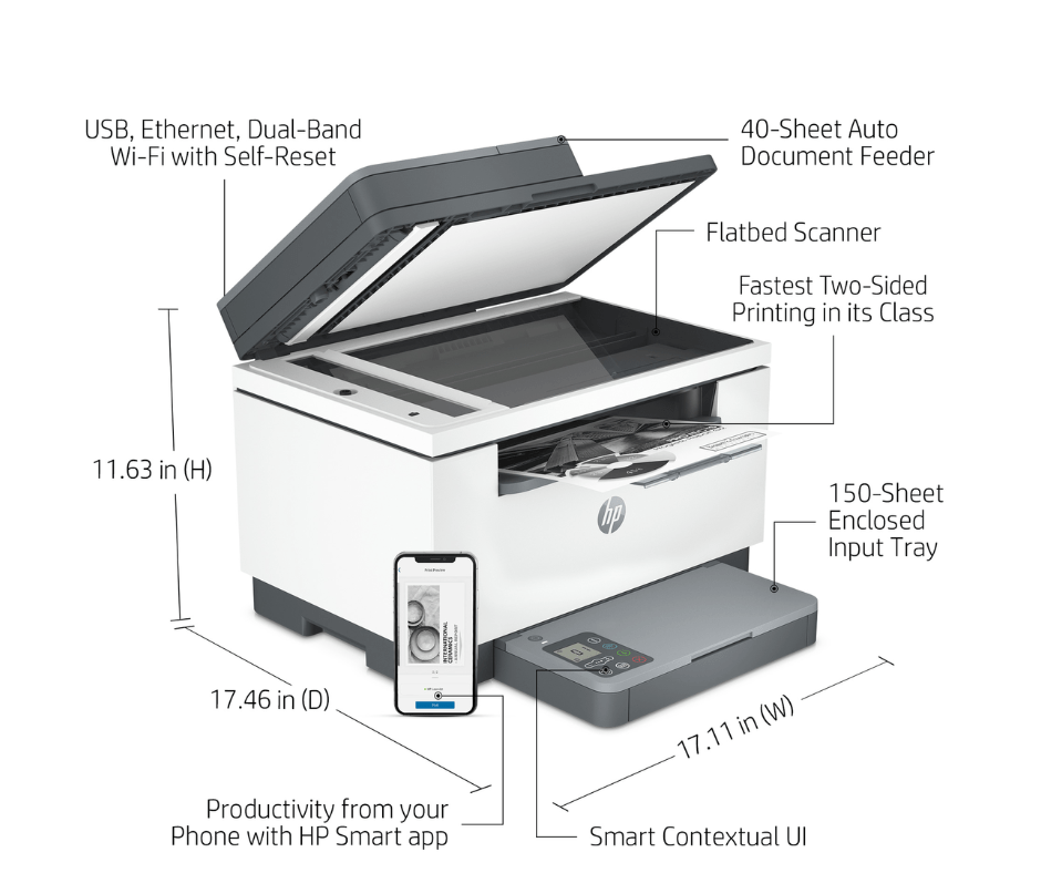 A high-productivity MFP with the fastest two-sided printing in its class 1 and the time-saving HP Smart app. 2 3 Count on peace of mind from more reliable connections, 4 and a worry-free experience with simplified setup.
