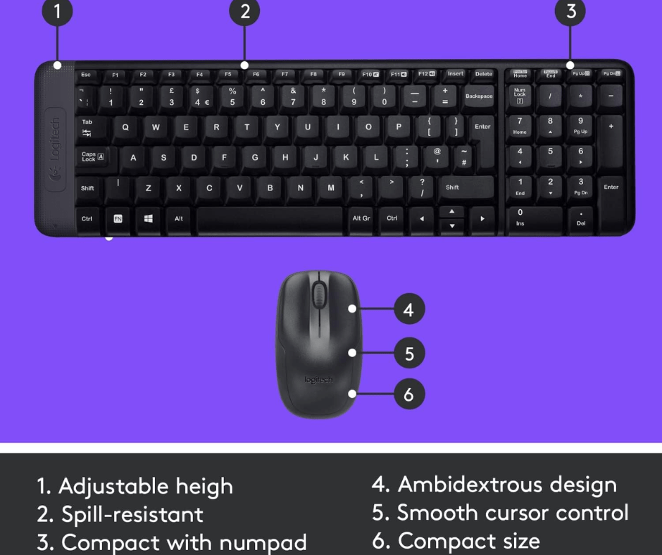 This combo is built with the same high quality standards that have made Logitech the global leader for mice and keyboards7Based on independent sales data (in units) aggregated for Logitech mice and keyboards from major global markets including Canada, China, France, Germany, Indonesia, Republic of Korea, Russian Federation, Sweden, Taiwan, Turkey, UK, US (July ’19 – July ’20 period). Retail channel only.. The keyboard is ready to withstand on-the-job use and mishaps thanks to the spill-resistant design.8Tested under limited conditions (Maximum of 60 ml liquid spillage). do not immerse the keyboard in liquid.