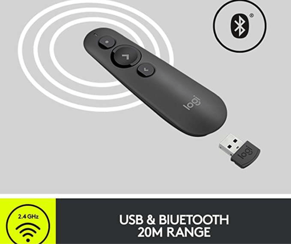 Logitech R500s Laser Presentation Remote Clicker with Dual Connectivity Bluetooth or USB for PowerPoint, Keynote, Google Slides, Wireless Presenter – Black (Class 1 Laser)