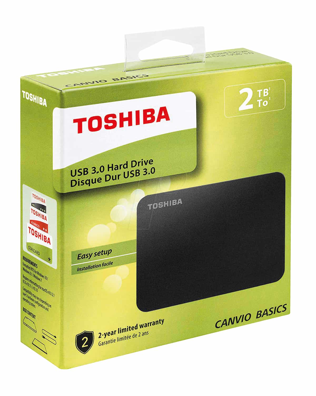 The Toshiba Canvio Basics 2TB External USB 3.0 Portable Hard Drive capacity offers plenty of storage space, while a sleek and compact design ensures easy portability. This Toshiba Canvio Basics portable hard drive transfers data at up to 5Gbps for rapid file access using USB 3.0 ports.